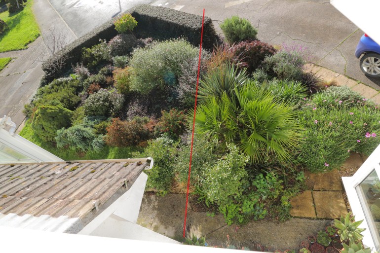 Out the front. Our next door neighbour went into a home a few months back and sadly died on Monday. I’ve been doing his garden for years and out the front treated his and ours pretty much as one space. We don’t know what will happen now, presumably the house gets sold and we get new neighbours. There are some nice plants on his side, like Mahonia eurybracteata subsp. ganpinensis ‘Soft Caress’, which is just about to start flowering. When I looked it up, I found it has its own website. I guess if someone moves in who doesn’t want the plants, we can dig and move them at this time of year. His is/was left of the boundary line in this upstairs view, it’s actually at least double the size of our side, the picture is misleading.