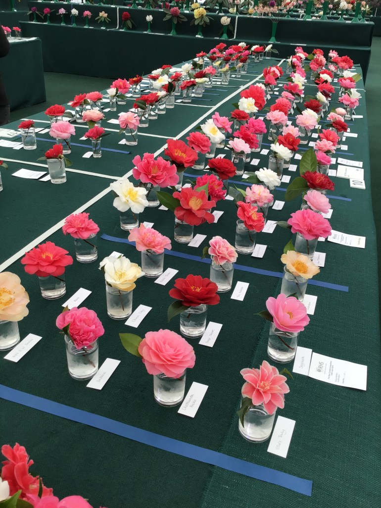 The blue riband class in camellias is the twelve. Twelve perfect blooms. Tragically the competitors who had staged their exhibits on Friday evening came in today to find that the marquee had been so cold over night as to have frozen the vases solid. As it happens, the best twelve were staged this morning, by a Cornish contingent I know very well. None of the frosted sets would have beat it even had they been perfect.
