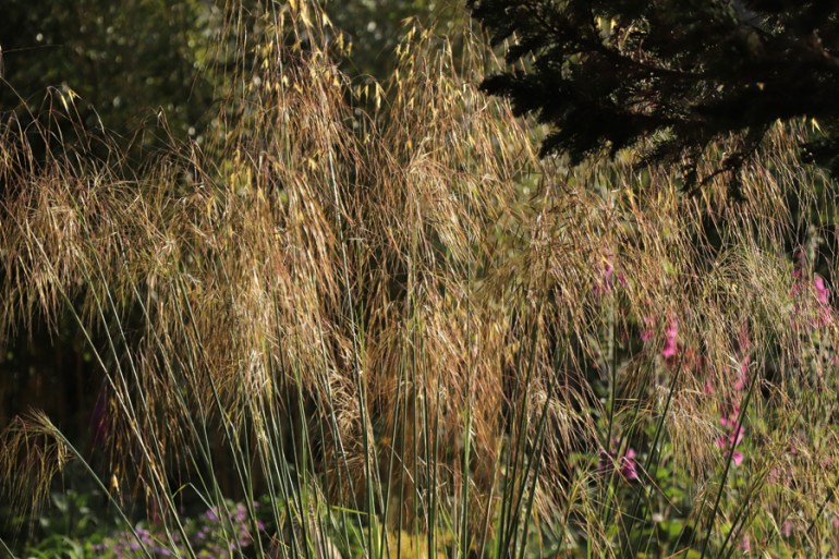 Stipa gigantea. This has proved to be a very long lived and low maintenance plant. It’s flowering very well this year and looks gorgeous in evening light against a dark background. Taking pictures of it is a different matter, one day I’ll get one I’m really pleased with.