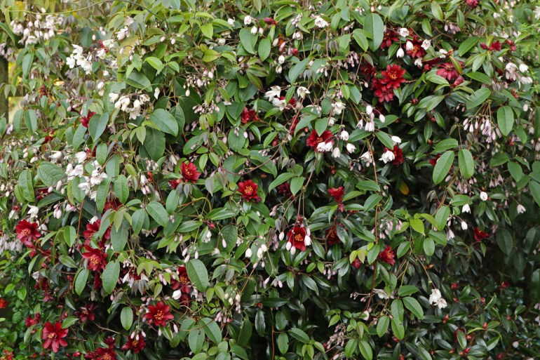 Holboellia brachyandra growing over Camellia ‘Nightrider’. There will need to be some hardening of the heart when the Holboellia finishes flowering because it will smother the camellia if not chopped back. For now I am enjoying the combination hugely.