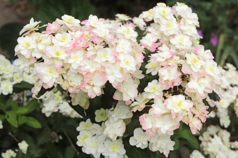 ‘Fuji-no-taki’ makes a small bush to a maximum of a metre, though mine is still only half that after a dozen or more years. It becomes completely covered in dense heads of double white flowers which almost completely hide the few fertile florets which technically make it a lacecap variety. The sterile florets start pure white with a greenish yellow centre, then gradually turn pink from the outer petals inwards. Close up photos reveal blemishes that you don’t otherwise notice.