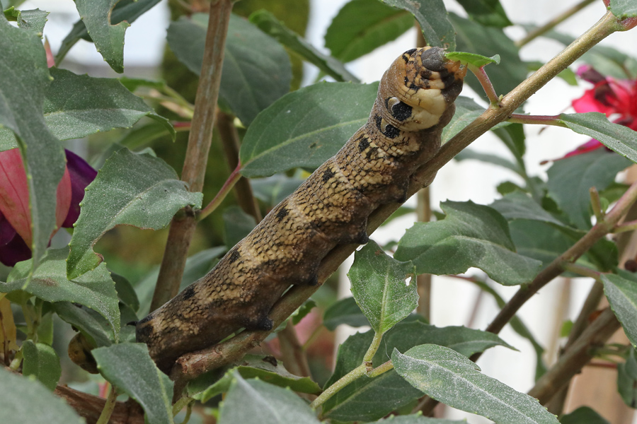 Elephant Hawk moth caterpillar. Two weeks back I included a video of Peacock butterfly caterpillars and a couple of days ago I found a chrysalis dangling from a lettuce leaf on a plant I’d brought home so I was going to include that. However, I was cutting concrete blocks with my angle grinder yesterday and spotted this beauty munching away about a foot from where I was working. He’s a bit dusty, but we had rain later so he’s had a shower. He’s at least three inches long. Later on, Sue called me down to deal with a large moth that was flying around downstairs. It was too lively to photograph but was a Convolvulus Hawk moth. It will have had a wing span over 3 inches and when I released it outside it flew off looking like a small bat.