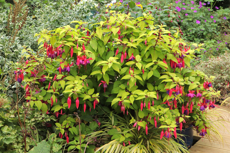 Fuchsia ‘Olga Storey’. We grow lots of Fuchsias, both in pots and in the ground. Without a doubt this is one of the best of them. We have a plant in full sun out the front, lots of flower but a bit of bleaching of the leaves due to getting too dry, another in a big pot behind the house, getting a few hours of sun in the afternoon and good for both flowers and foliage, and a third that gets almost no sun, very good for foliage, not many flowers. It seems fairly impervious to both rust and capsid, big problems elsewhere. Whether you can get hold of it from anywhere is another matter entirely.