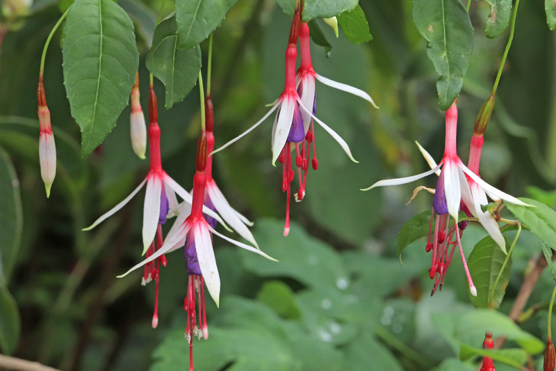 Fuchsia ‘Lady Bacon’. ‘Lady Bacon’ is a form of Fuchsia magellanica with white sepals. This seems to be a recurring mutation in Fuchsias with red tube and sepals and purple corolla. ‘Logan Woods’ is very similar and we recently bought a variety called ‘Arauco’ which is the same at half the size. ‘Lady Bacon’ will make a large shrub and develop attractive peeling bark.