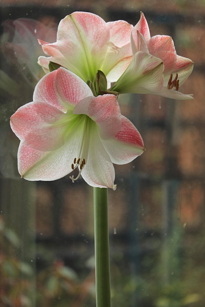Not in the garden at all is this Hippeastrum ‘Apple Blossom’. I took its picture by the window, so there’s a fuzzy view of garden fence behind it. I bought a few different ones this year, this one is flowering, one has a bud starting to move and the other three are doing nothing. You couldn’t plan a wedding round them.