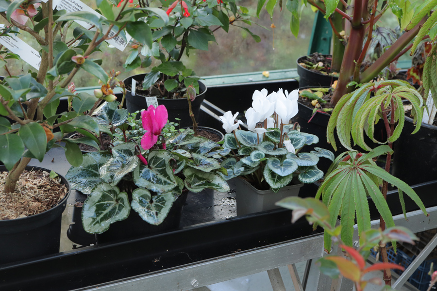 Cyclamen. Last year we bought several of the cyclamen that the garden centres are full of at this time of year, the ones that sometimes get described as hardy, sometimes not. We planted them in the garden and I wasn’t very happy with how they looked but thought they’d all die so wasn’t unduly bothered. One survived to flower again this year and on its own, amongst C. hederifolium and C. coum, it looked out of place, so I dug it up and potted it, replacing it with a good C. hederifolium form that needed planting out. It’s now inside alongside the single white flowered plant of the same ilk I bought this year, and that simply because it smells divine. I had to sniff a bench-full to get the best one.