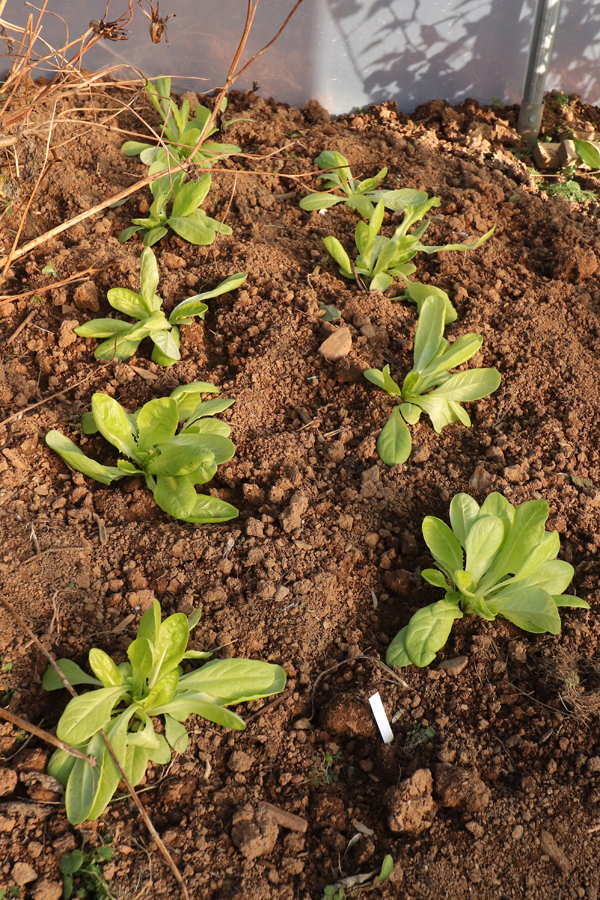 Lettuce ‘All Year Round’. Sown 3/10/2020 in cells, then potted into 9cm pots. I planted out 9 into the ground in my tunnel on 27th December. They have since had a few frosts which they’ve survived and are so far untouched by slugs, mice or voles. I figured if they survived the first week I could breathe more easily. The seed packet gives a sowing range of February to August and a harvest interval of 10-12 weeks from sowing. I’m well outside the sowing date range and after 14 weeks they’re a good way off being usable. I sowed some more yesterday. I sowed a short row of Radish alongside the lettuce in the tunnel, to see what happens.