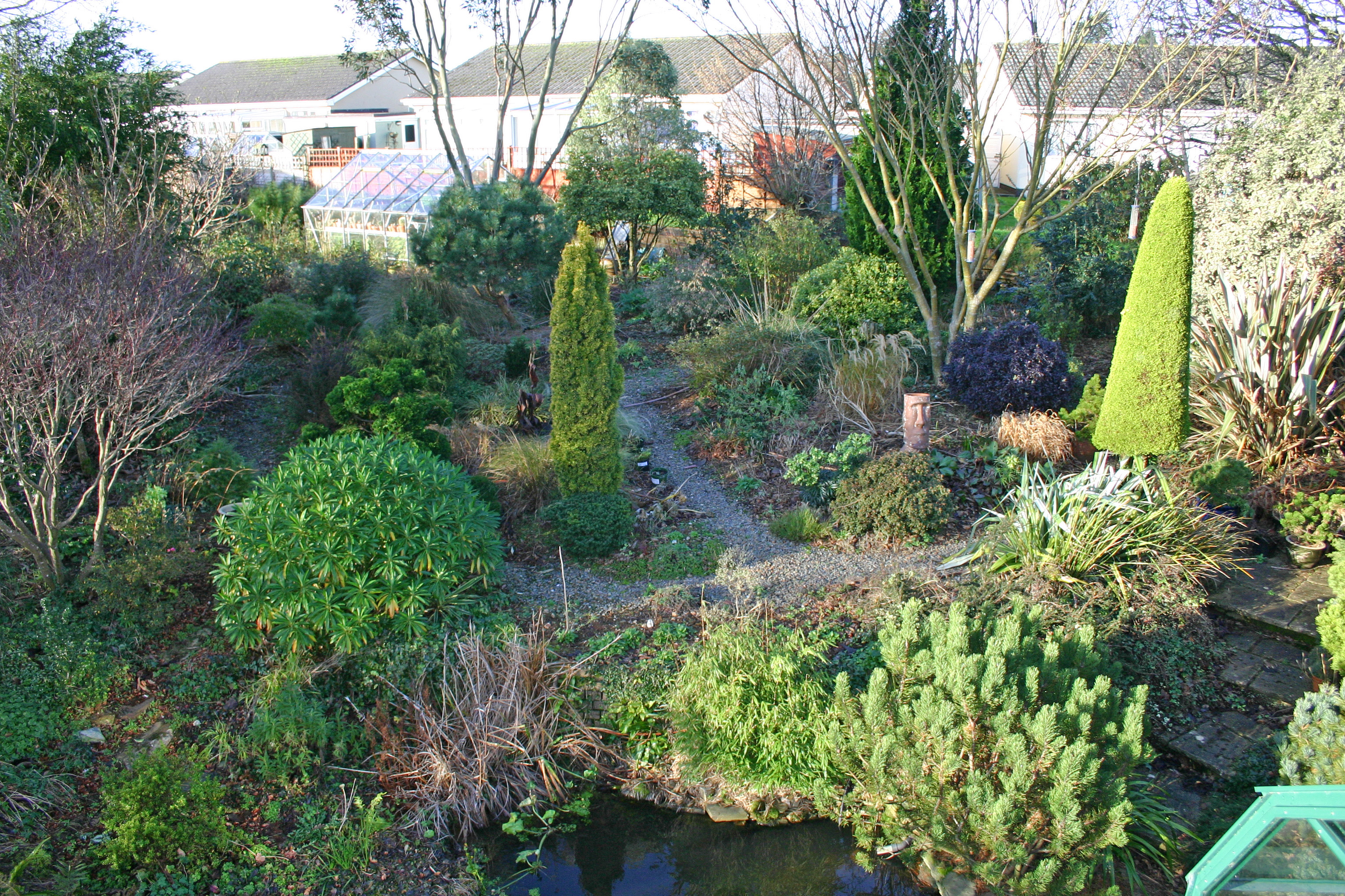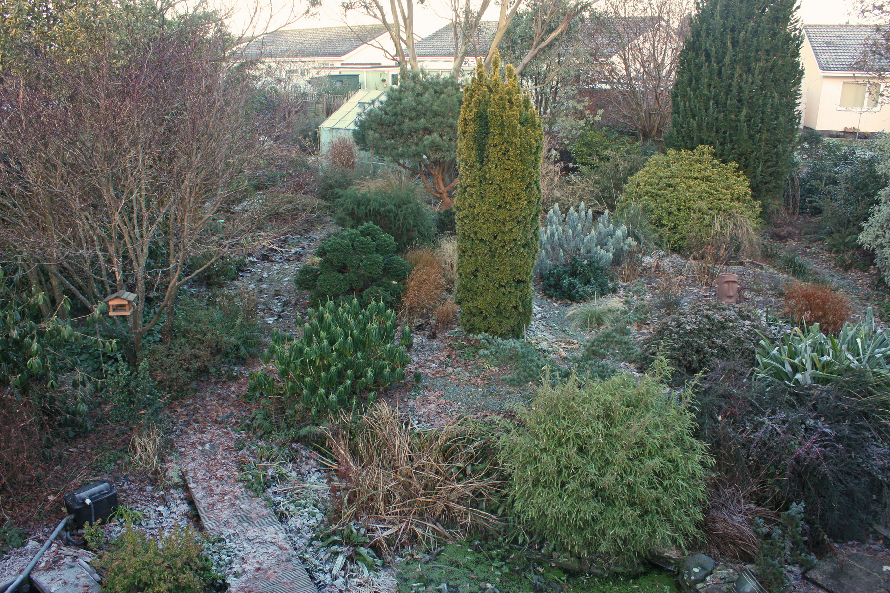 Step forward another six years to 8/12/2010 and on a bitterly cold winter’s day it is a dull but largely green scene. The big evergreens are starting to really dominate. There’s a large hazel to the left of the big conifer which is on the middle of the bank along the back and I’m reluctant to cut it right down as it’s right on the boundary. I’ve cloud pruned the Chamaecyparis obtusa to the left of the Taxus ‘Standishii’, to try and make it more interesting and stop it getting bigger.