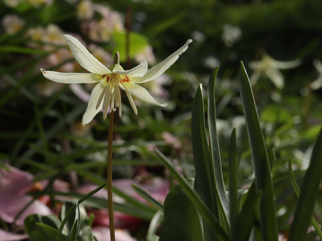 Erythronium ‘White Beauty’. Two years ago I planted some of these and they struggled to get going. I concluded I’d allowed the bulbs to shrivel a bit waiting for clear ground to plant them in. Last year I planted them as soon as they arrived. They don’t seem to have fared any better. Still, they’ve survived and the earlier lot seem to have settled in and maybe increased a little. I was getting excited about Erythronium dens-canis a few weeks back, they seemed to be doing really well, but the combination of removing a low shading branch from the Magnolia they were hiding under, plus strong sunshine, has not been kind to their flowers.