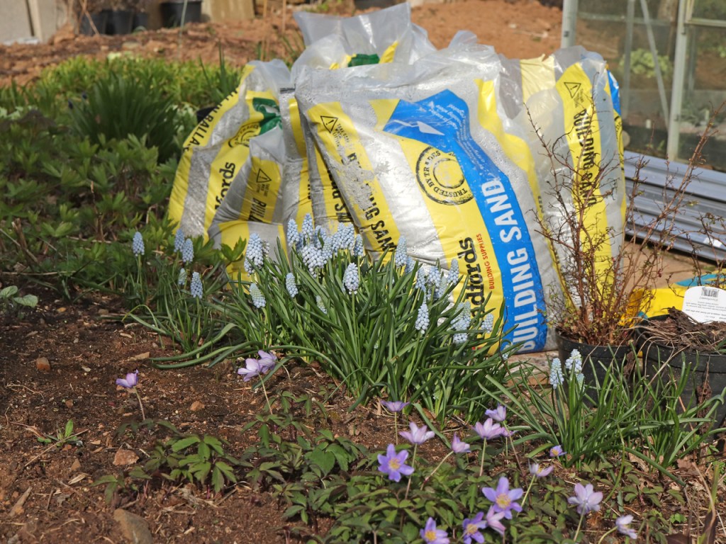 Muscari by contrast are less well behaved, but this one, Muscari ‘Valerie Finnis’, has mostly stayed in a clump with just a couple of new colonies starting up from seedlings; so far at least. I like its powder blue colour and its foliage is tidier than the original species. It helps greatly just at the moment to look from the right angle, a classic example of how the camera can lie. The blue wood anemone is possibly ‘Buckland Blue’, a fabulous colour but outwith this weeks six so forget I mentioned it.