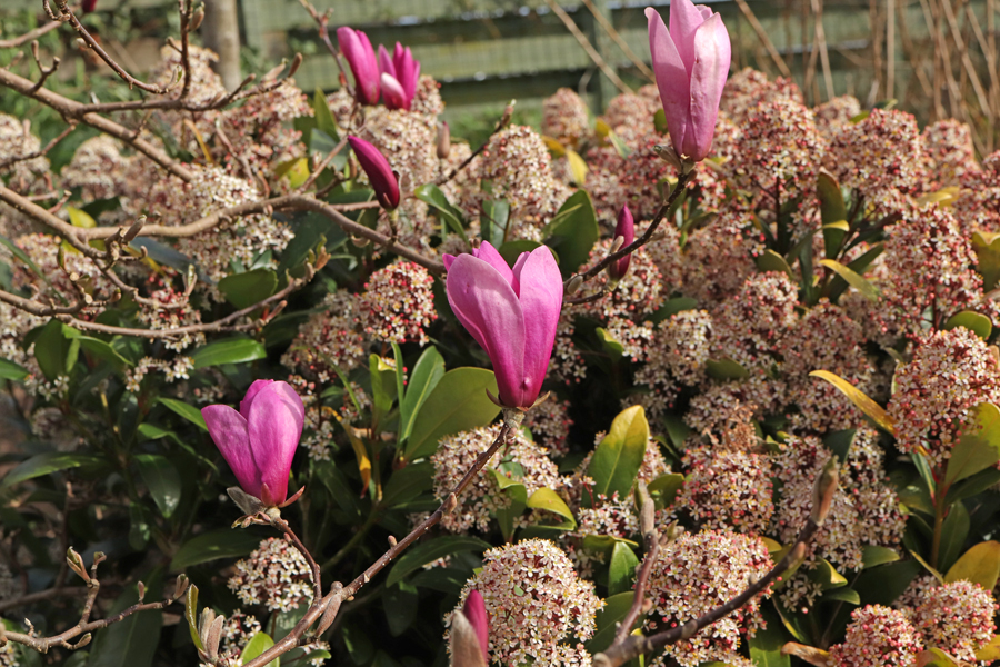 Magnolia ‘Ann’. Another two for the price of one picture; it’s hard not to get a background of gatecrashers. It seems to me that the Magnolia is earlier than usual but I don’t keep a record so that’s probably wrong. The Skimmia has been buzzing with bees, bumbles and honey bees, and a couple of days back I saw a humming bird hawk moth visiting it, which was quite a surprise. It’s also perfuming the entire garden. Maybe I should have focussed on the Skimmia and branded the Magnolia a gatecrasher.