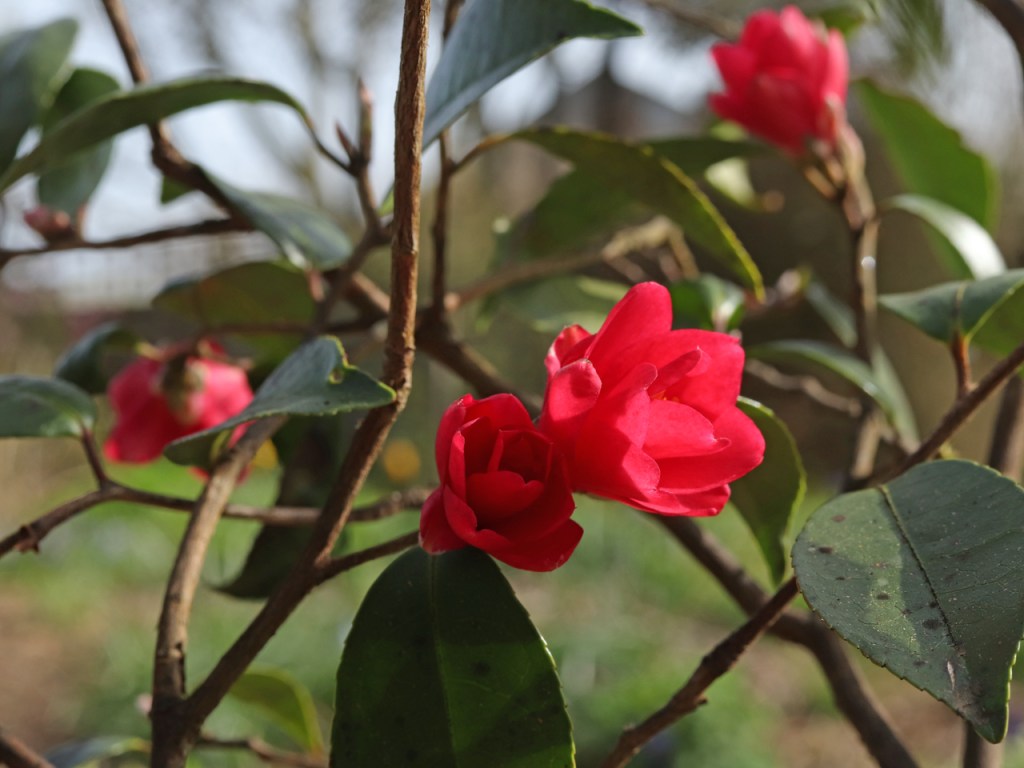 Camellia ‘Fairy Wand’. Consistent with my changing taste in Camellias, I planted this about a year ago to replace a large flowered red japonica called ‘Eximea’. It was a fine plant, just getting into its stride, so I dug it up and I don’t even remember what I did with it, and replaced it with this, which I’ve had in a pot in the tunnel for years. It’s not the hardiest so the fact it’s made it through its first winter outdoors and even produced a few flowers, is enough to make me think it worth a mention. This has very small, very vivid flowers, in clusters at the nodes, at least it will do when it gets going. Actually, looking at its parentage, I’m not sure why I thought it wouldn’t be hardy. It was raised by Os Blumhardt, which for those in the loop is a case of ’nuff said. (Magnolia ‘Star Wars’, Camellia ‘Nightrider etc.)