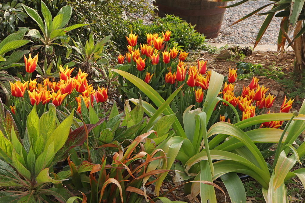 Now that’s the way to plant tulips! How many in a pot then Jim? And well done on finishing the greenhouse extension. That corner does look very different now. And thanks for the extras – I saw that same Grevillea today in Glendurgan Gardens. Thought it was a Grevillea, but so very different – in habit and leaves – that I thought maybe I was mistaken as I had not heard of a prostrate kind! Grevillea x gaudichaudii apparently.