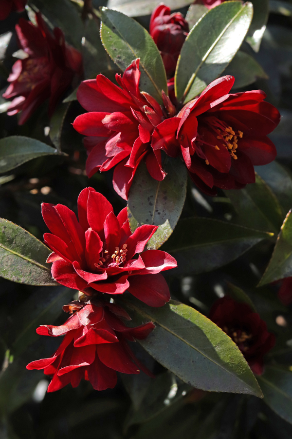 The flowers are quite small, about 2 inches across. The cross was ‘Ruby Bells’ x ‘Kuro-tsubaki’, the same as for ‘Black Opal’, which I’ve never seen. ‘Ruby Bells’ was another of his, saluenensis x ‘Kon-wabisuke’. ‘Kon-wabisuke’ is considered to be a wild form of C. japonica, with small, very dark red flowers. The red pigment in Night Rider is right through the wood and root system.