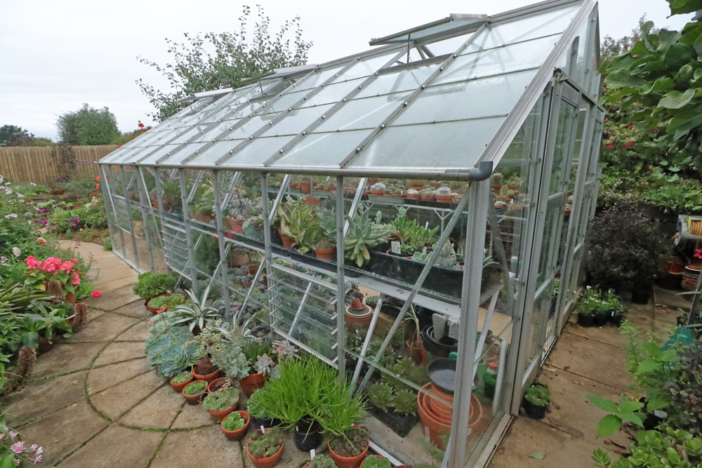 There is an integral gutter down both sides of the glasshouse and with the wisdom of hindsight I would have constructed the glasshouse with a slight fall, perhaps 1:500, front to back. For many years the gutter on one side was open both ends and the water ran out into tub trugs at both ends. On the other side it was blocked at the back and at the front ran via a length of pipe into a 230L water barrel a meter or so away from the glasshouse. The barrel had a tap but we usually dunked a watering can in the top. The pipe was a Heath Robinson affair and being at gutter height (1.38m, 41 6”) we walked into it all too frequently.