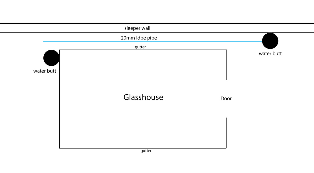 I put a water barrel at one rear corner of the glasshouse with the flow from the gutters feeding into it. A length of aluminium profile carries the water across the rear end of the house. I kept the lid provided with the barrel and made holes just big enough to feed the water into it. To the tap take off I connected a 20mm LDPE (low density poly-ethylene) pipe which runs along the side of the glasshouse, just below ground, to join the original water barrel located conveniently a few feet from the glasshouse door. Rainfall feeds into one barrel and via the connecting pipe, fills them both. When a can-full is scooped from the front barrel, it is replenished from the back barrel. The water level in the two barrels always remains the same. All I need to do is keep the gutters clean and we get an excellent supply of clean rainwater.