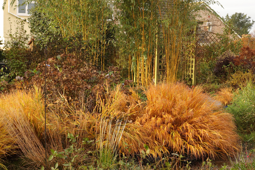 Hakonechloa macra ‘Albovariegata’. Winter is when grasses truly come into their own, partly for form and partly for colour. The Hak macs are usually the brightest thing in the garden in December, January and February, then they fall apart, get cut to the ground and start over again. I managed to be out with the camera during the five minutes of sunshine we had yesterday, which helped.