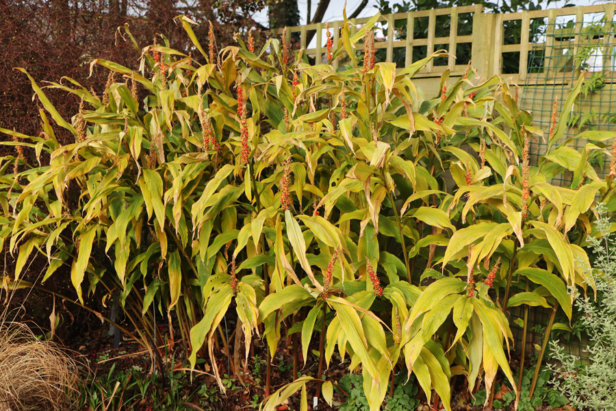 Hedychium densiflorum ‘Assam Orange’. The flowering period on this is quite short but structurally it is good for months and it both turns more or less yellow and produces bright orange fruits, a bonus for December.