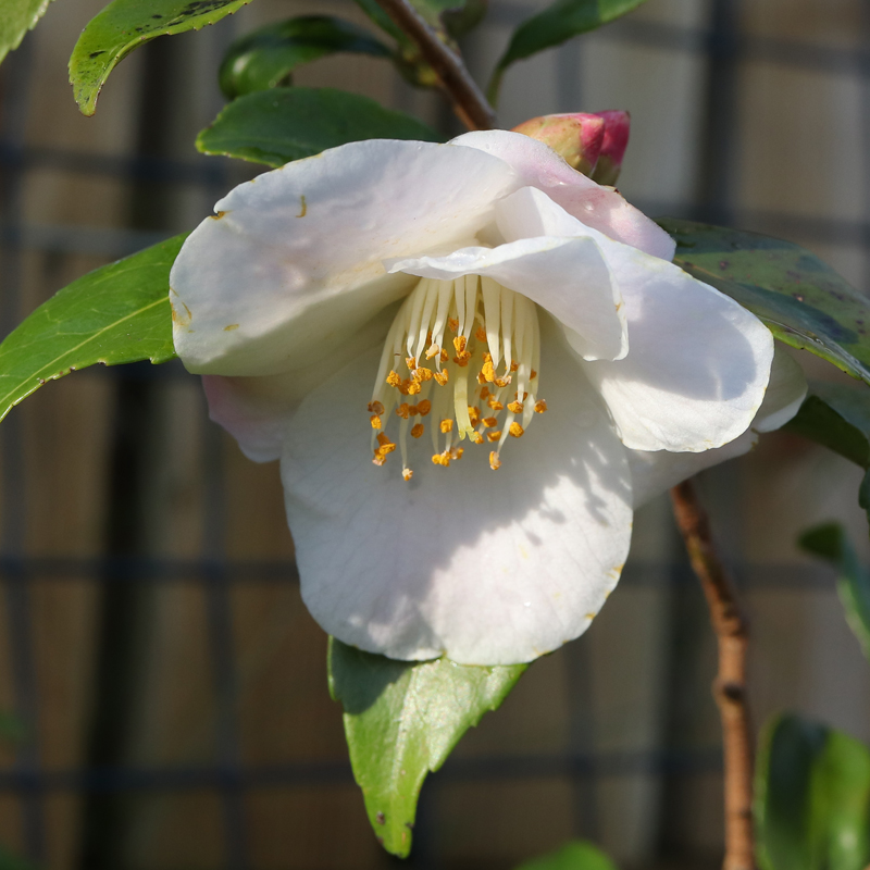 Camellia ‘Quintessence’. This was planted out a year ago having been in a pot too long. It improved a bit over the year but has some way to go to be stunning. Small single flowers, white with a pink flush, scented. Another New Zealand raised lutchuensis hybrid.