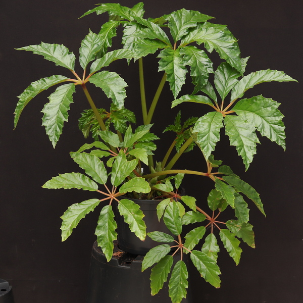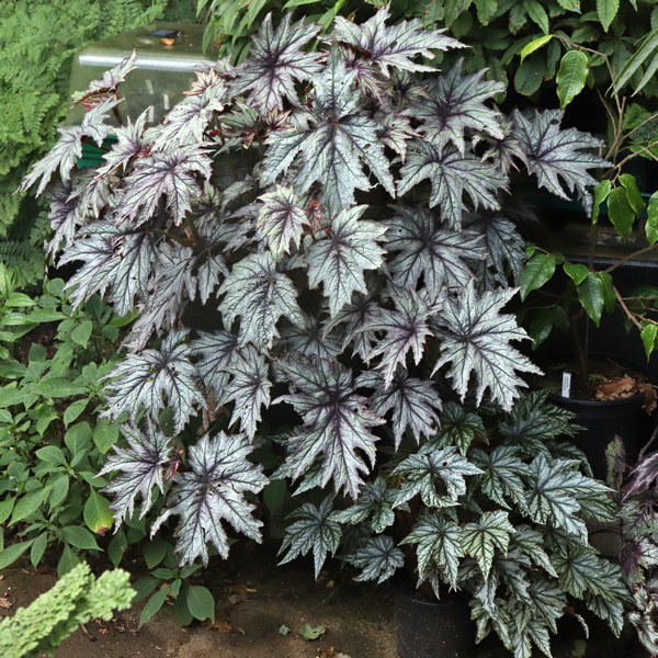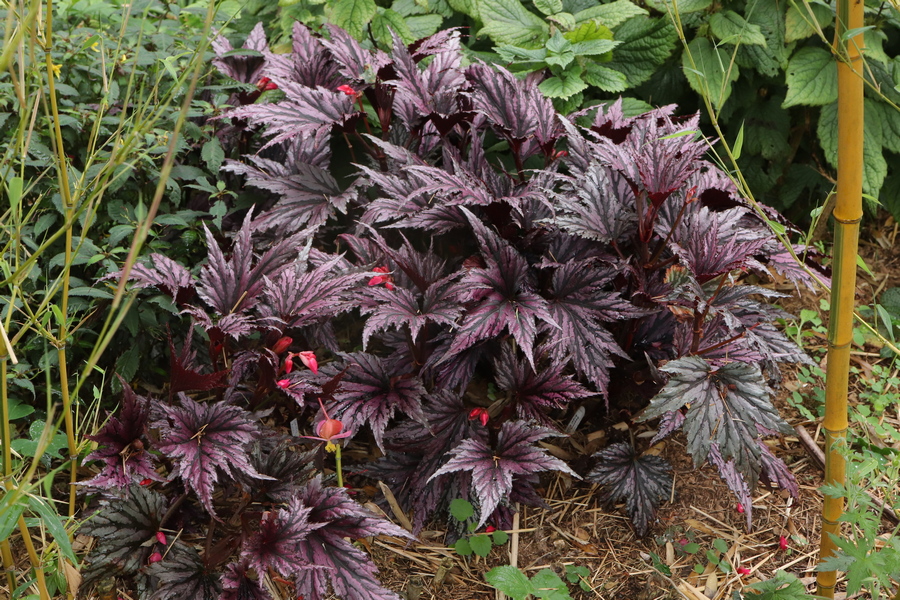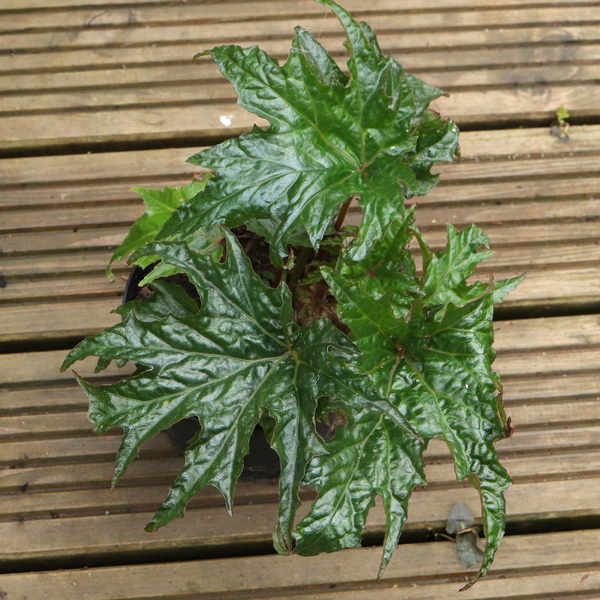 Begonia U614 doesn’t seem to have been given a name yet but has continued to do well in spite of it. I split my large overwintered plant in two when it came to planting time, both are doing well. A piece of the original plant which I left in the ground in its first winter, then lifted in the second, was evidently not all removed as it has reappeared and is doing moderately well in its original location, having been in the ground through three or four winters now. I still have a few seedlings of it that I have been struggling to keep going. A couple seem to be making headway now, less deeply lobed and lacking any silvering, so not in any way an improvement. I will keep them until they flower at least.