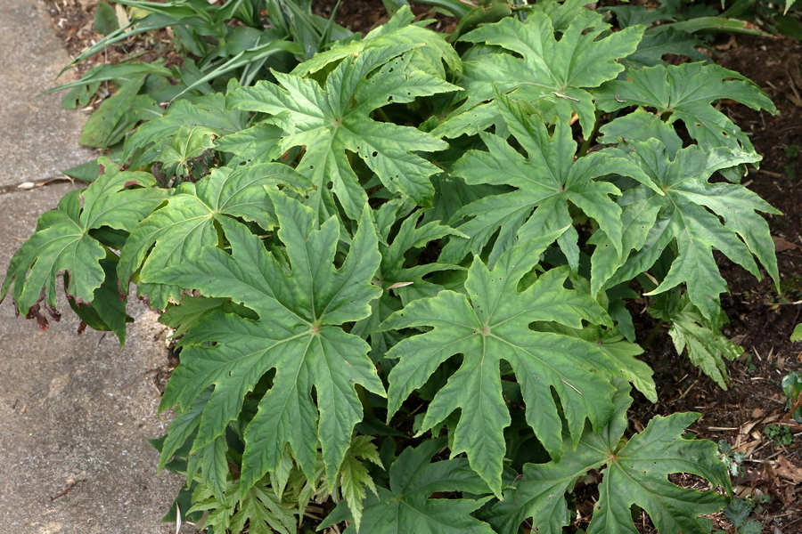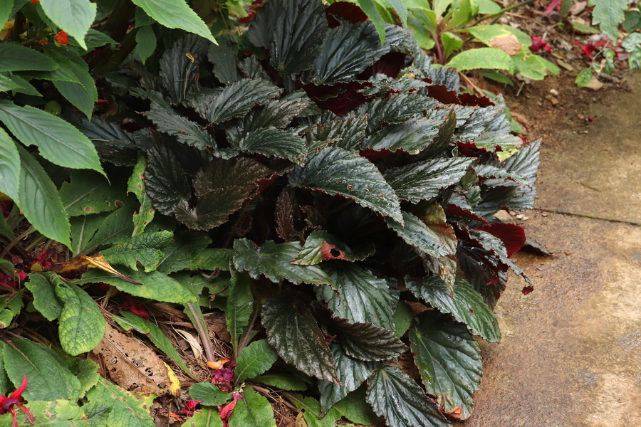 Not far behind, in terms of growth, is B. ‘Mishmi Silver’. It has very dark green foliage, discreetly marked silver and red underneath. Looking at earlier pictures, the silver was more prominent last year. Fallen fuchsia flowers have created mouldy spots on the leaves but it is still a great foliage plant. Unfortunately it doesn’t flower until deep into winter, by which time I will have lifted it and brought it under cover.