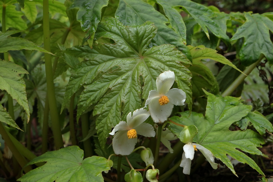 Also picked up at Tregrehan but I don’t remember from which nursery stall and there is nothing on the label, was a plant labelled Begonia aff. panchtharensis. I should have asked questions but it was busy and I was in a rush. Is it known to be close to B. panchtharensis, perhaps a seedling that looked a bit different, or did the seller not know and B. panchtharensis was what it looked like to them? If I buy something that is claimed to be “real” B. panchtharensis is it going to be any different? It certainly looks like pictures of B. panchtharensis online. It is a very ornamental plant and has made good growth in the time it has been in the ground. It is thirsty and wilts if too dry, has even suffered scorching to the leaves, but now that I am wise to that I am keeping it moist. In late June it produced large white flowers on short stems that kept them below the foliage, in contrast to online pictures of the species which show them coming above the foliage. Until I have a backup plant I shall lift it for winter.
