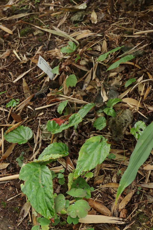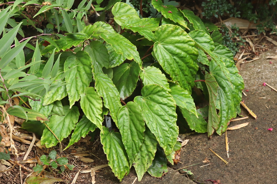 Begonia tengchiana is a Taiwanese species that was a mail order purchase from Farmyard Nurseries in Camarthenshire. When it arrived in April it was a good sized and robust plant which when the risk of very cold weather passed I planted in the garden under the bamboo near where B. baviensis was to go later. It has continued to thrive and is now in flower, perhaps not as showy as some but in combination with good foliage, a plant I am very happy to have. They say it is supposedly hardy to -8°C so I may see if I can detach a piece to keep indoors for winter, then leave the main plant out. Surviving through winter is one thing, I have a few that have done that, but if they are then in such poor condition that they struggle to get going in the new season, it is not a good strategy to leave them out. The Hosta incidentally, is ‘Devon Green’.