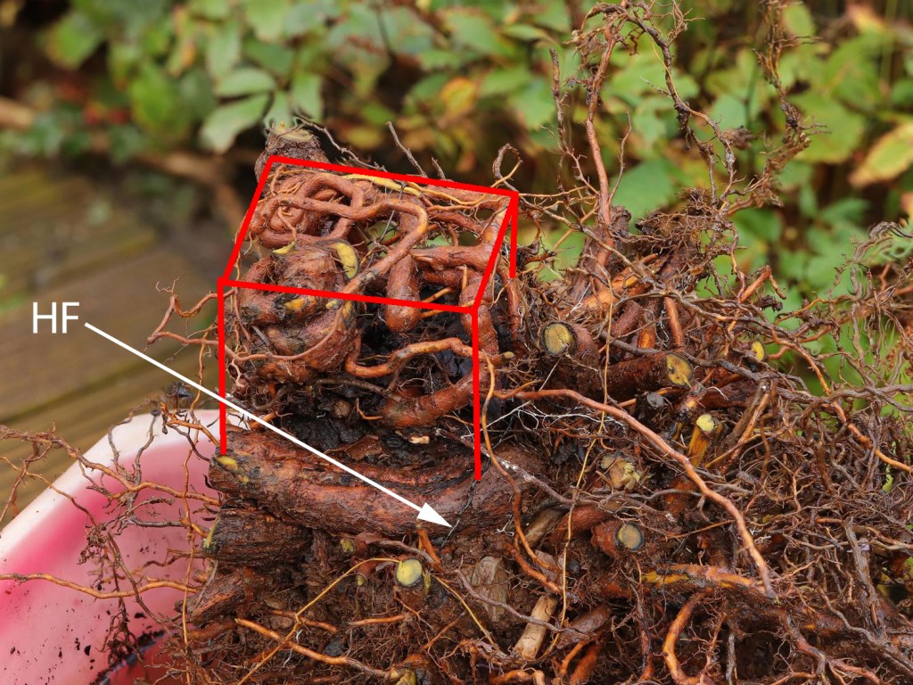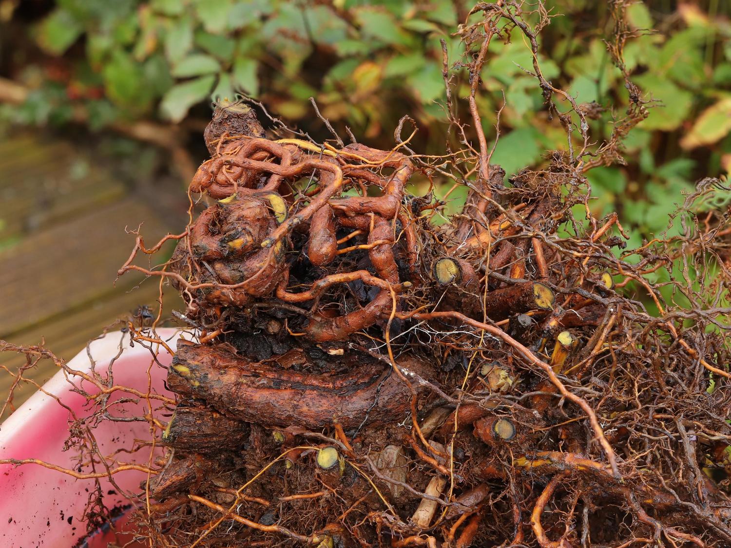 Close examination of the root system revealed two serious problems. Firstly, there were several black thread-like strands running through the root system, the unmistakable rhizomorphs of Armillaria, aka Honey Fungus. FIne strands of white fungal mycelium were probably more of the same. Secondly, the central part of the root system was still locked into the shape, not of the 3L plant pot from which I had planted it out, but the 9cm square liner pot that it would have been growing in before it was potted into the 3L pot.
