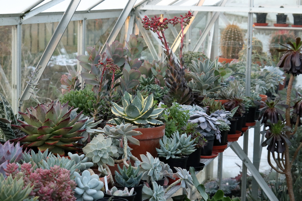 Agave parryi ‘Cream Spike’ is the variegated Agave with black spikes in the middle of the picture. An arbitrary choice of subject but one of Sue’s collection that I am pretty unconcerned about in the cold. The real worry is the Aeoniums, the least hardy and most expensive of the stuff in her glasshouse. None have turned to mush though they look a bit limp. Hopefully they’re just in need of a drink, which they can have when it warms up a bit. Most of the rest go October to March without water, the Aeoniums need a little.