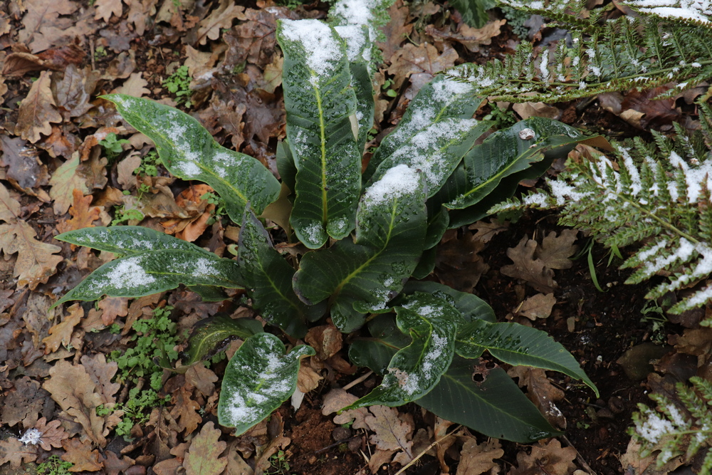 A couple of weeks ago I mentioned a Begonia I had bought at Tregrehan Plant Fair in 2020. It was one of only two plants purchased on that occasion, which for me counts as some kind of record. The other one was Pyrrosia sheareri, a fern. It looks quite similar to Asplenium scolopendrium, our native hart’s tongue fern, but the fronds are darker, thicker and have a pale felted underside. Nothing like our native hart’s tongue fern in fact. It comes from China, Taiwan and North Vietnam. It looks to have survived the cold unscathed, though I probably shouldn’t count my chickens, far too soon to judge. The ferns are mostly looking pretty passable around the garden.