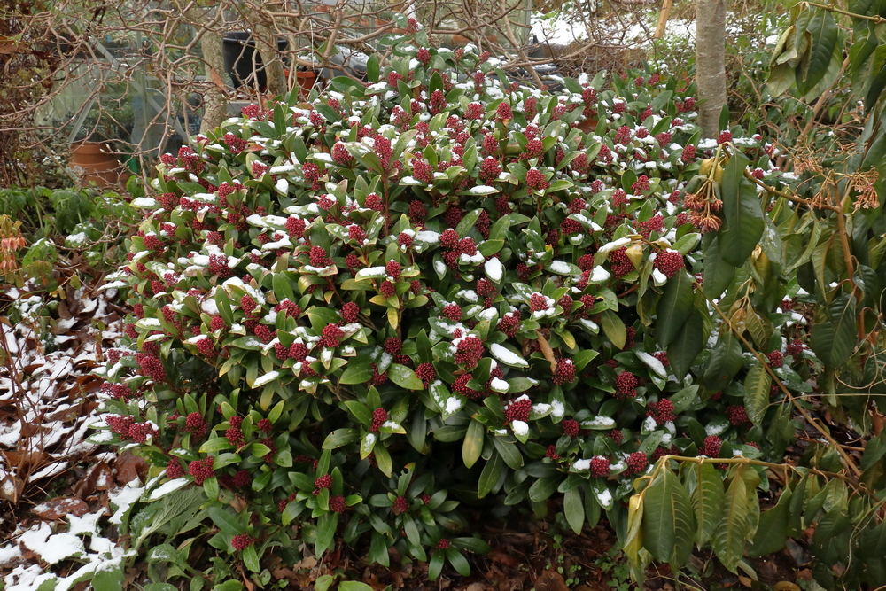 The Skimmia plant is beautiful. There is a bush outside my house that looks very similar to this, although its heads are white. It gives off quite a powerful fragrance in Spring.