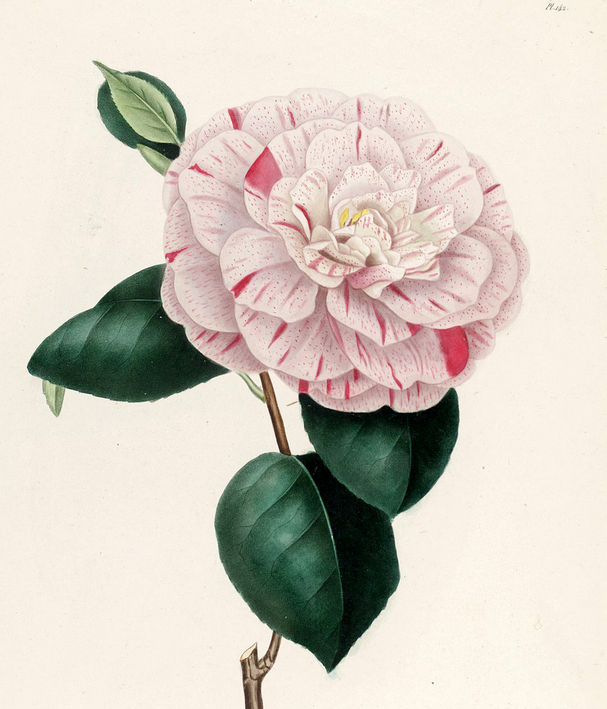 Back in the mid nineteenth century, nurserymen and others had to make their camellia illustrations by hand. There are several books available from the period and the pictures are often very skilfully executed and beautiful. Whether they are an adequate basis on which to base an identification has to be highly questionable. They can help narrow the field but without corroborating evidence are of limited value. I was experimenting with trying to create a modern photographic equivalent, using Camellia ‘Annette Carol’. I don’t think I’m quite ready to go to print. The other picture is from the 1843 Iconographie du Genre Camellia by M. L’Abbé Berlèse and is the variety C. japonica ‘Maculata Superba’, a plant of which is at Mt Edgcumbe.