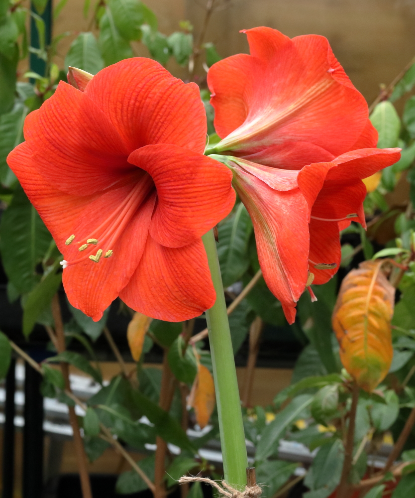 Hippeastrum ‘Naranja’, (Amaryllis to some of you) which is actually in the house, just a few feet from my computer. I took it out to the conservatory to take its picture and failed to remove all the yellow leaves from the Fuchsia behind it.