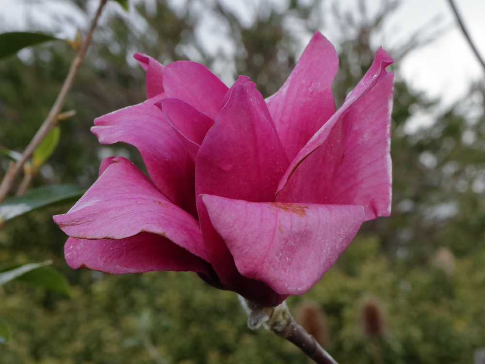 Top of today’s pile is my Magnolia ‘Vulcan’. It has opened a few flowers and they have been looking good from a distance, especially in sun and against a dark and brooding sky. Strong wind and Magnolia flowers are not a good combination though, so it’s best not to look too closely.