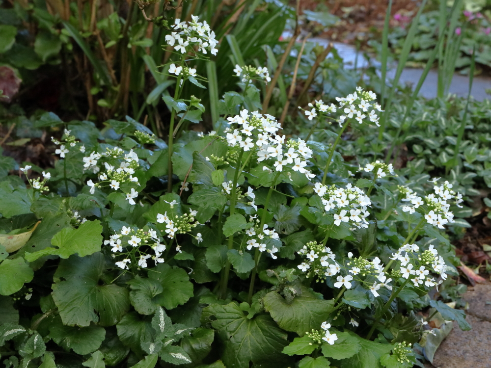 Pachyphragma macrophyllum is perhaps not the most spectacular of plants but does its thing proficiently enough in conditions of shade and dry that very few more refined or showy plants couldn’t cope with. Too bad it got saddled with such a terrible name. It seeds very freely so dead heading and a watchful eye are part of its regime.