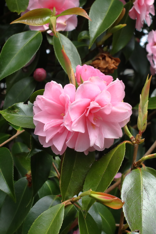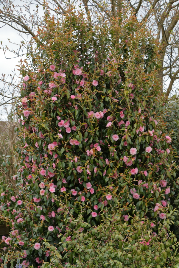 Camellia season is all but over for this spring, with just a few late varieties strutting their stuff. One such, and a great plant for smaller gardens, is Camellia ‘Spring Festival’. It is naturally columnar, my plant is now 13 feet tall, it has masses of small pink flowers in April and May when the risk of frost damage or petal blight is less and it has quite good colour in its new growth.