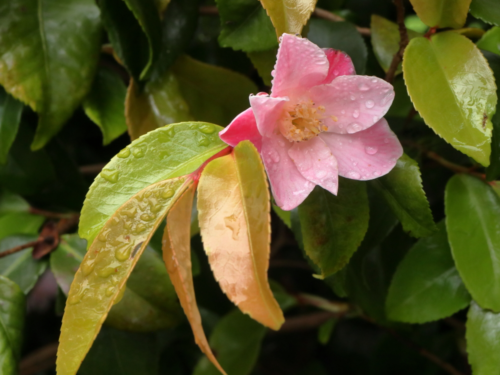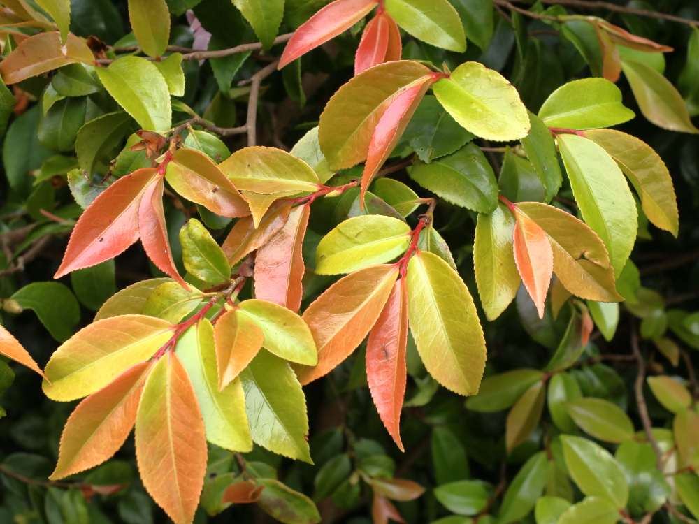 Camellia ‘Minato-no-akebono’ still has one or two of its scented blooms that it has been producing since the turn of the year. That’s not the story here though, it’s the turn of the new leaves to shine.