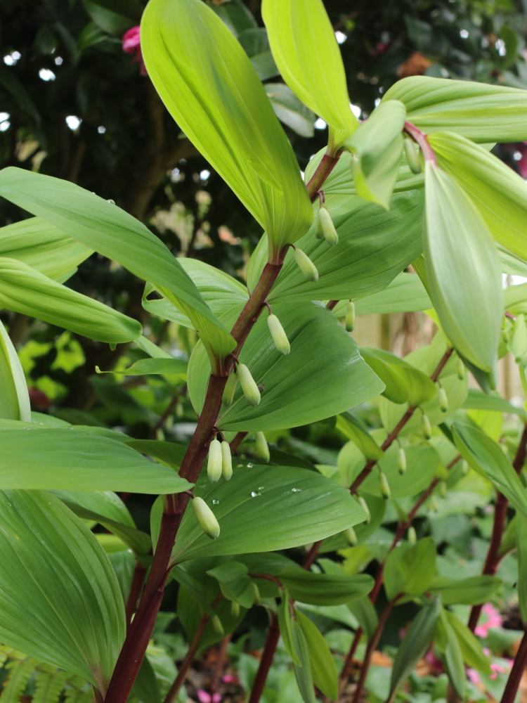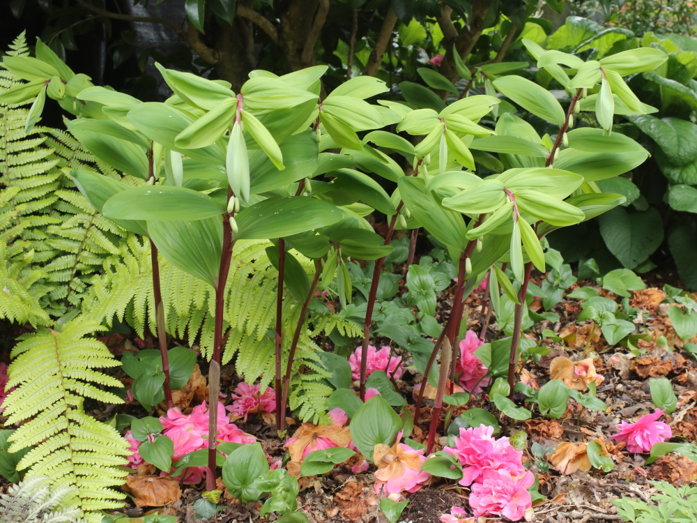 Polygonatum odoratum ‘Purple Stem’ is one of those understated woodland plants that almost always gets passed over in favour of something more colourful when it comes to picking six things at this time of year. It can also get a serious mauling from the molluscs but so far seems fairly unscathed this year. If I’d cleared away the fallen flowers from Camellia ‘Debbie’ it would have made a rather different picture. The ground level heart shaped leaves are Maianthemum bifolium, which is taking over that part of the garden but without bothering anything else.