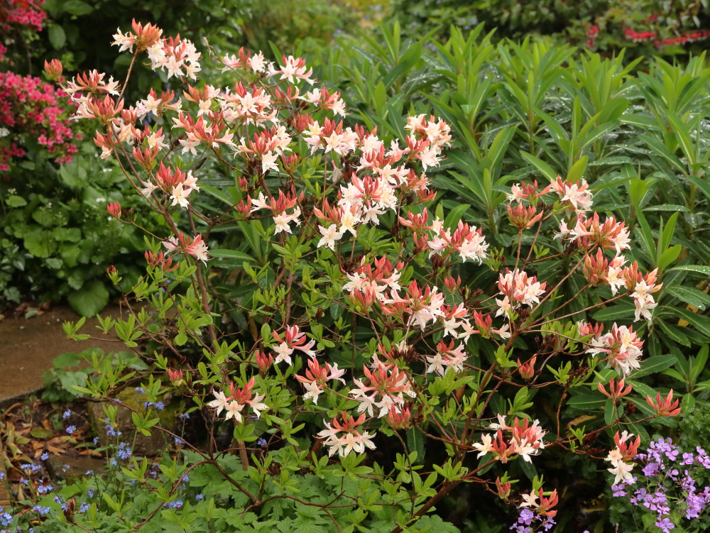 Rhododendron with no name. A seedling I raised from seed collected from R. atlanticum except it was probably a hybrid of some sort and then hybridised again with who knows what to give me two quite different seedlings. This is much the better of the two and as well as being pretty, it has a wonderful scent that is almost as good as its parent.