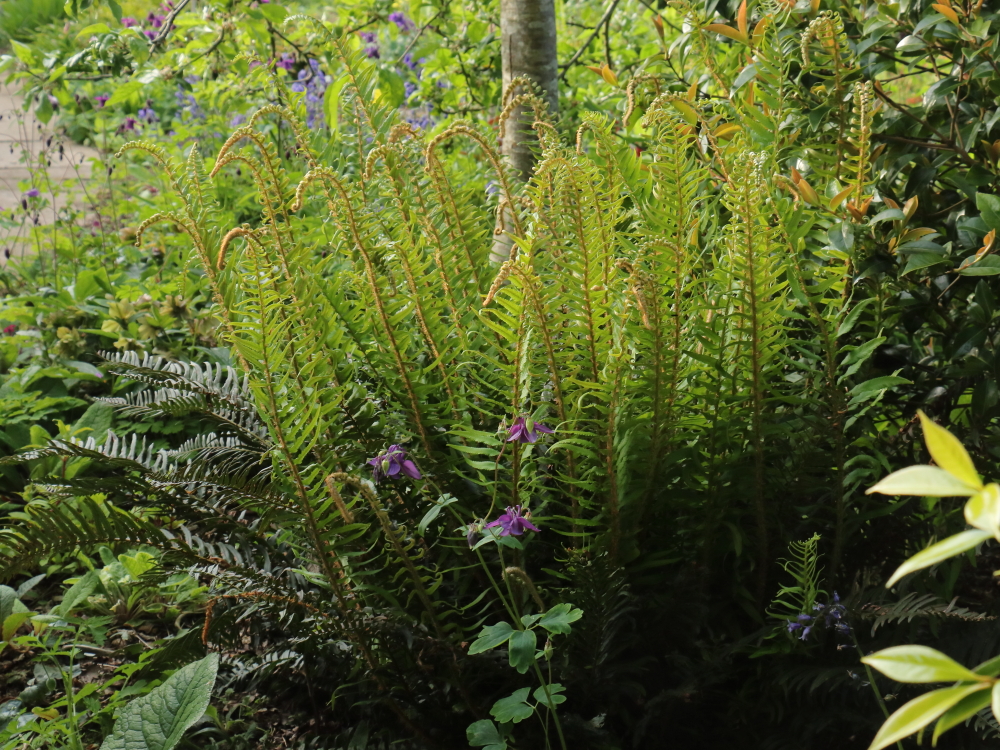 Polystichum munitum, the Western Sword Fern, is very common in the western US and often appears, unremarked upon, in the background of pictures of gardens from there. If is very distinct from the three species of Dryopteris that are ubiquitous in the UK so I am pleased to have it in the garden and pleased that it seems happy to be here. The cool wet spring seems to have suited my ferns very well, this one is producing fronds 3 feet tall, a foot taller than it has done before.