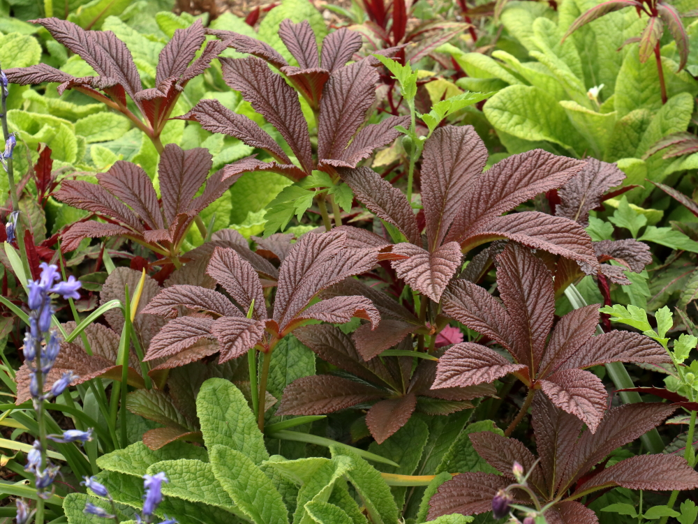 Rodgersia ‘Bronze Peacock’ is looking mighty fine with its new leaves. I have it growing in ordinary garden soil and it gets too try in summer to really suit it. I should maybe get another plant to go in the bog garden, where it would surely be much happier.