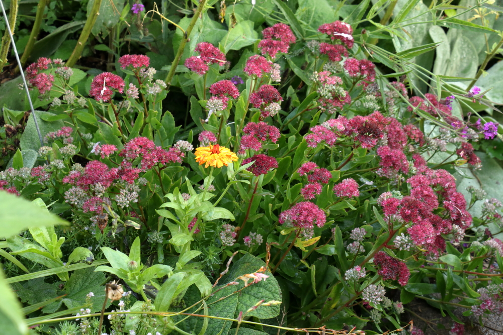 Hylotelephium telephium. A plant that grows wild in the hedgerows hereabouts and this is simply the wild form, though I acquired it from a garden. As a local native plant it is pretty bombproof, but left to its own devices it grows 60-75 cm tall and falls over. This year I gave it a Chelsea chop, a treatment meted out at the same time to its hybrid with H. spectabile, ‘Herbstfreude’. It’s worked a treat with both of them, I have compact domes about 30cm high which are still standing up. The most impressive thing about the plant pictured is that on almost every night for the last two months I have picked off several vine weevil adults, usually two or three, sometimes more. I’m amazed it’s still alive. It received a very generous dose of nematodes when I was treating stuff a week or so back. There are selected forms of it about, purple leaved, yellow flowered; which would probably succeed here too.