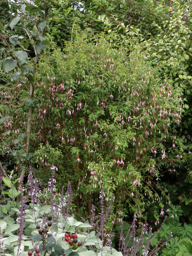 Fuchsia ‘Lady Bacon’. I think I’m right in saying that these Fuchsias with red tubes and white sepals are variants that occur very rarely in the wild. It’s certainly what I read about ‘Arauco’, which has similar colouring and which we also have. ‘Lady Bacon’ is a pretty standard Fuchsia magellanica except for the flower colour, hardy enough for the top growth to escape serious damage in most winters in the milder counties, so capable of growing into a large shrub.