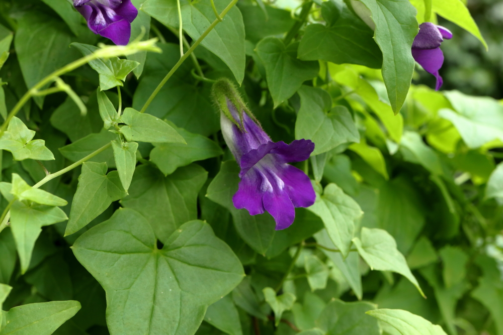 Maurandya barclayana. Last year we bought an unlabelled, red flowered climbing plant from a small local nursery, planted it in a big planter and gave it a 1m metal obelisk to climb up. It turned out that 3m would have been more suitable and it flowered most of the summer. It would have been awkward to overwinter it under cover so it was left out to take its chances, with the thought in mind that we would simply buy another this year if it died. It died. A minimal amount of protection would probably have kept it alive, the roots seemed sound but the ground level buds had been killed. Buying another didn’t pan out either, the nursery didn’t do it this year because it hadn’t sold last year. The wholesale plug supplier from whom she’d obtained her stock are no longer listing it either; last year they had it listed as Lophospermum ‘Red Wine’. Depending on where you look, Maurandya and Lophospermum are pretty closely related if not the same and Plant World Seeds were listing Maurandya barclayana and M. erubescens ‘Magic Dragon’, so I ordered seed of both. They were sown 15th May and Maurandya barclayana is just starting to flower, suggesting that treating it as an annual wouldn’t really work. I need to carry the plants I have over to next year and hopefully they’ll flower through next summer.
