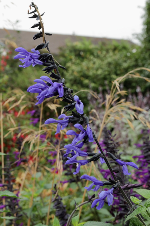 On an earlier trip down to the far west we had visited a small nursery and picked up a Salvia, on the strength of its name alone, which was ‘Carine’s Amazing Blue’. It is now flowering and I’m sorry to say that it appears identical to Salvia guaranitica ‘Black and Bloom’. I’m not at all sure how that differs from Salvia guaranitica ‘Black and Blue’, if at all. Suffice it to say that it is a fine plant, similar in all respects to ‘Amistad’ except for colour, and in fact the colour stands out rather better than ‘Amistad’, especially in the fading light of early evening. ‘Carine’s Amazing Blue’ (on the left) and ‘Black and Bloom’, may look a little different in these pictures but in the flesh are indistinguishable.