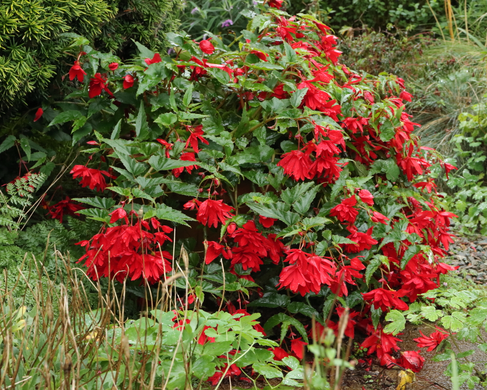 Begonia ‘Illumination Scarlet’. Under this lot is a big terracotta pot about 14 inches high and 18 wide. I planted several of these red weeping begonias around the front and put a couple of upright ones at the back; same colour flowers, nearly, but with darker leaves. Big mistake, looked all wrong, so when I saw some more ‘Illumination Scarlet’ reduced, half way through the season, I grabbed them and replaced the upright plants. Keep it simple. Just how many times do I need to learn a lesson before it sticks?
