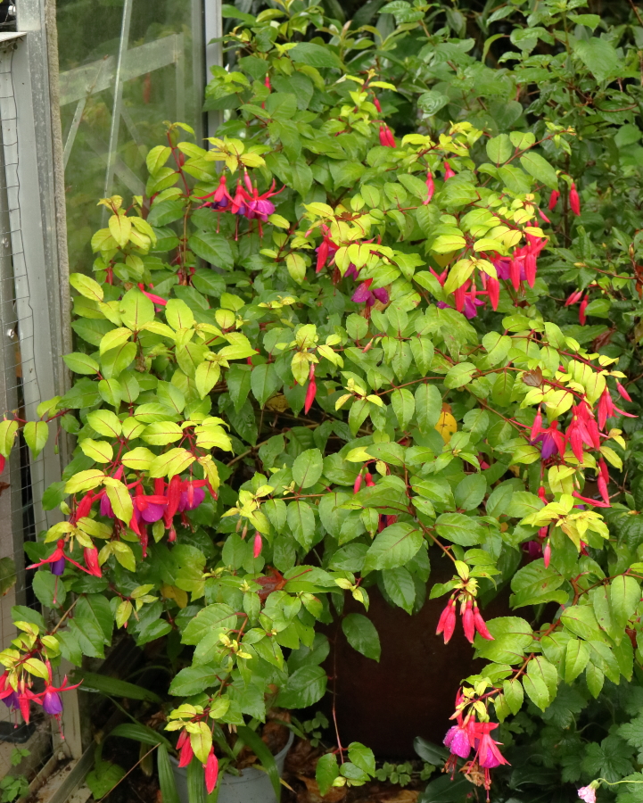 Fuchsia ‘Olga Storey’ is in a similar sized pot, three plants of the same variety. One of our best performers, is Olga. Really good leaf colour, large bright flowers and seemingly, and I hope I’m not tempting providence by saying this, unattractive to all the problems we get with many other varieties, like capsid, rust, gall mite and flea beetle.