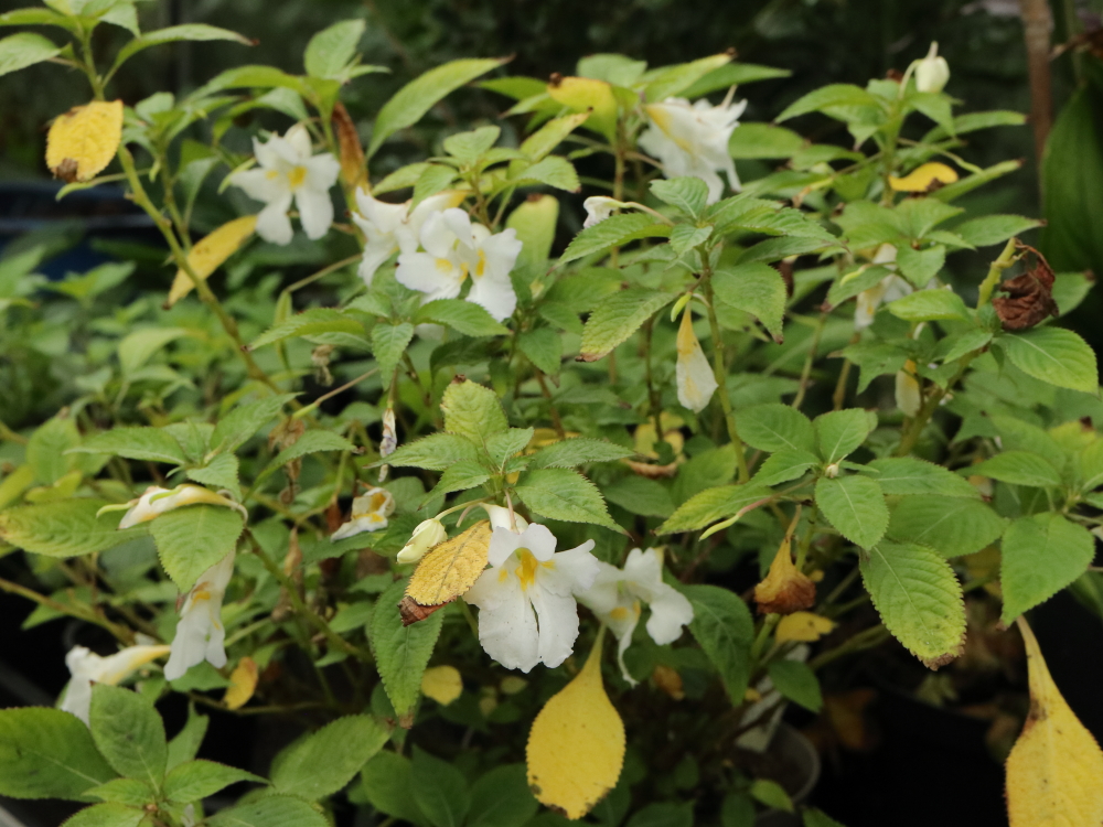 Impatiens arguta ‘Alba’, in a pot, in the greenhouse. This seeds moderately about the place and when the seedlings are in the wrong place I tend to dig them up and pot them, thinking I can give them away or even sell them from our garden open sales table. Come the winter more than a few such unwanted plants get unceremoniously dumped to make greenhouse space for things we actually want.