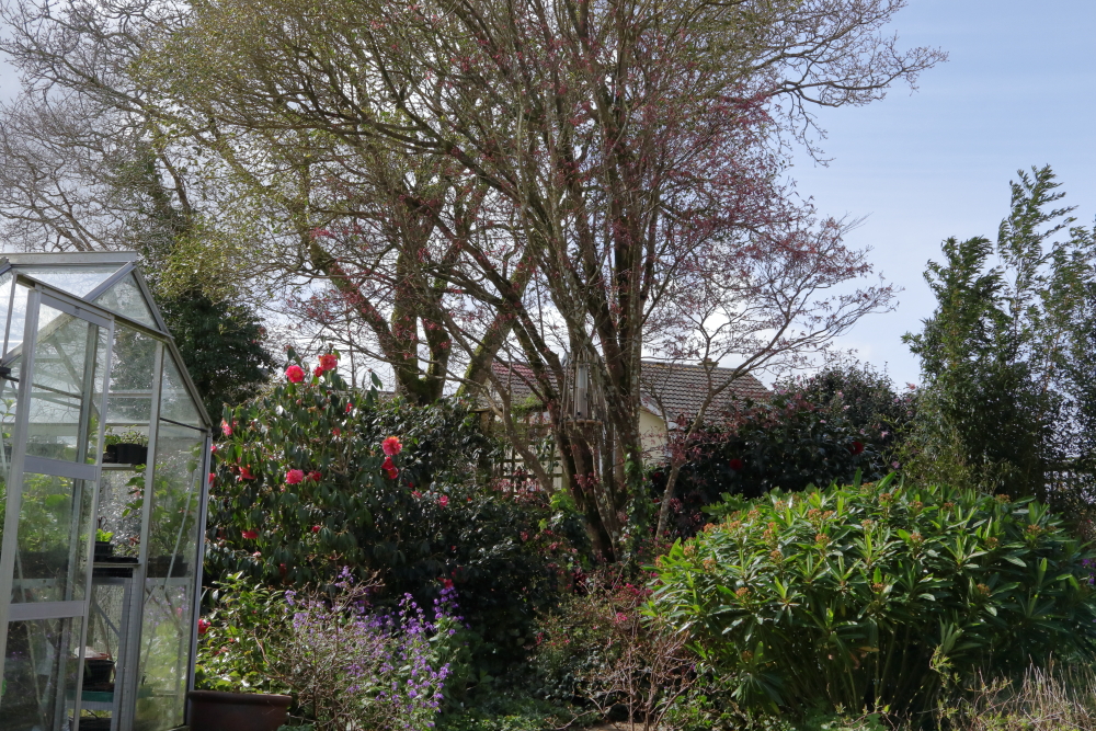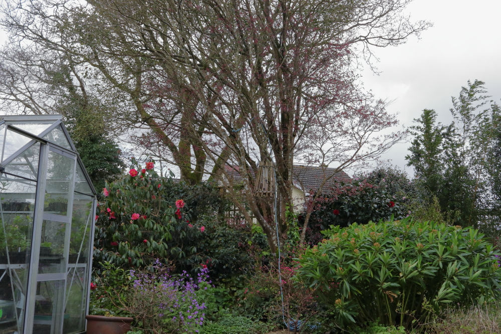 The long slow agonising death of our Acer palmatum ‘Atropurpureum’ continues. Another large branch was almost completely devoid of new shoots and has now been carefully removed. I did before and after images, which suggest that the visual impact was slight; the reality is not so good. The sideways angle that would have shown how much has gone also had the camera pointing straight at the sun. It’s the branch with the rope tied to it that goes.