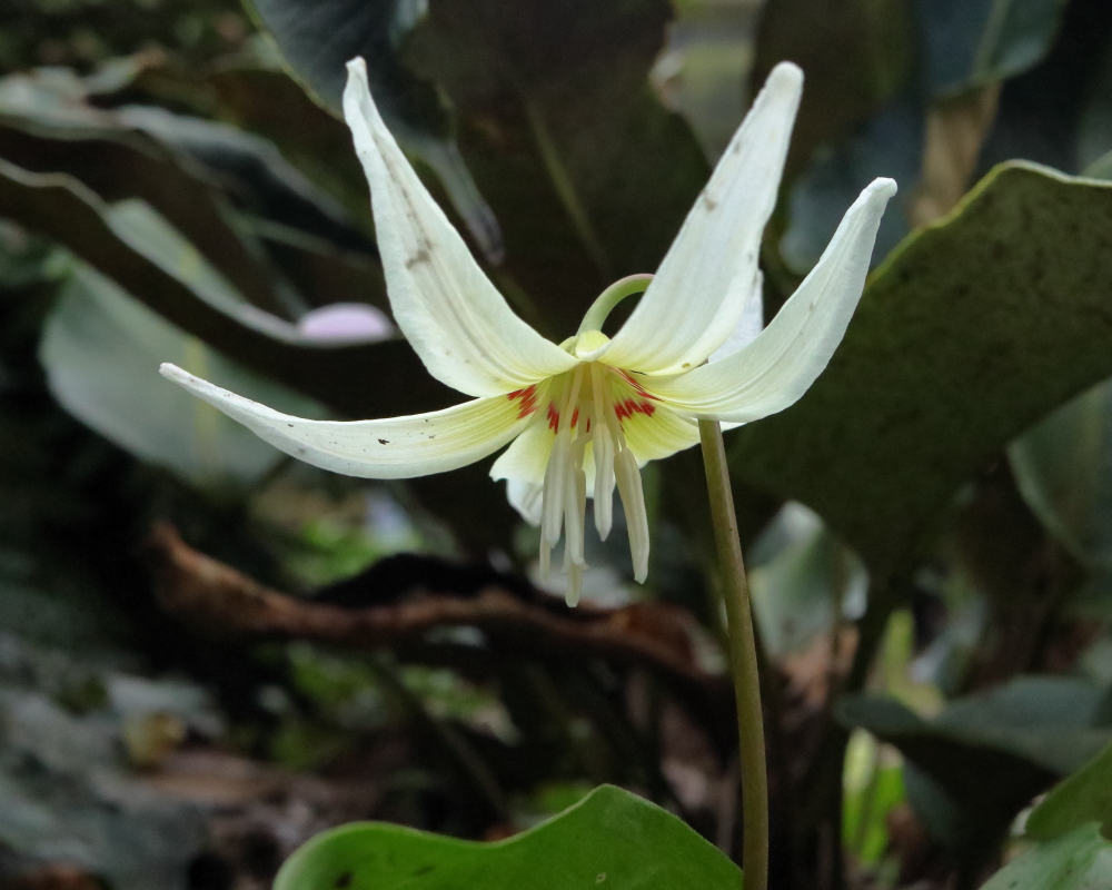 Erythronium ‘White Beauty’ is another plant that flowers too close to the ground to stay clean through endless torrential rain. At least I have mainly succeeded in keeping slug damage to an acceptable level.